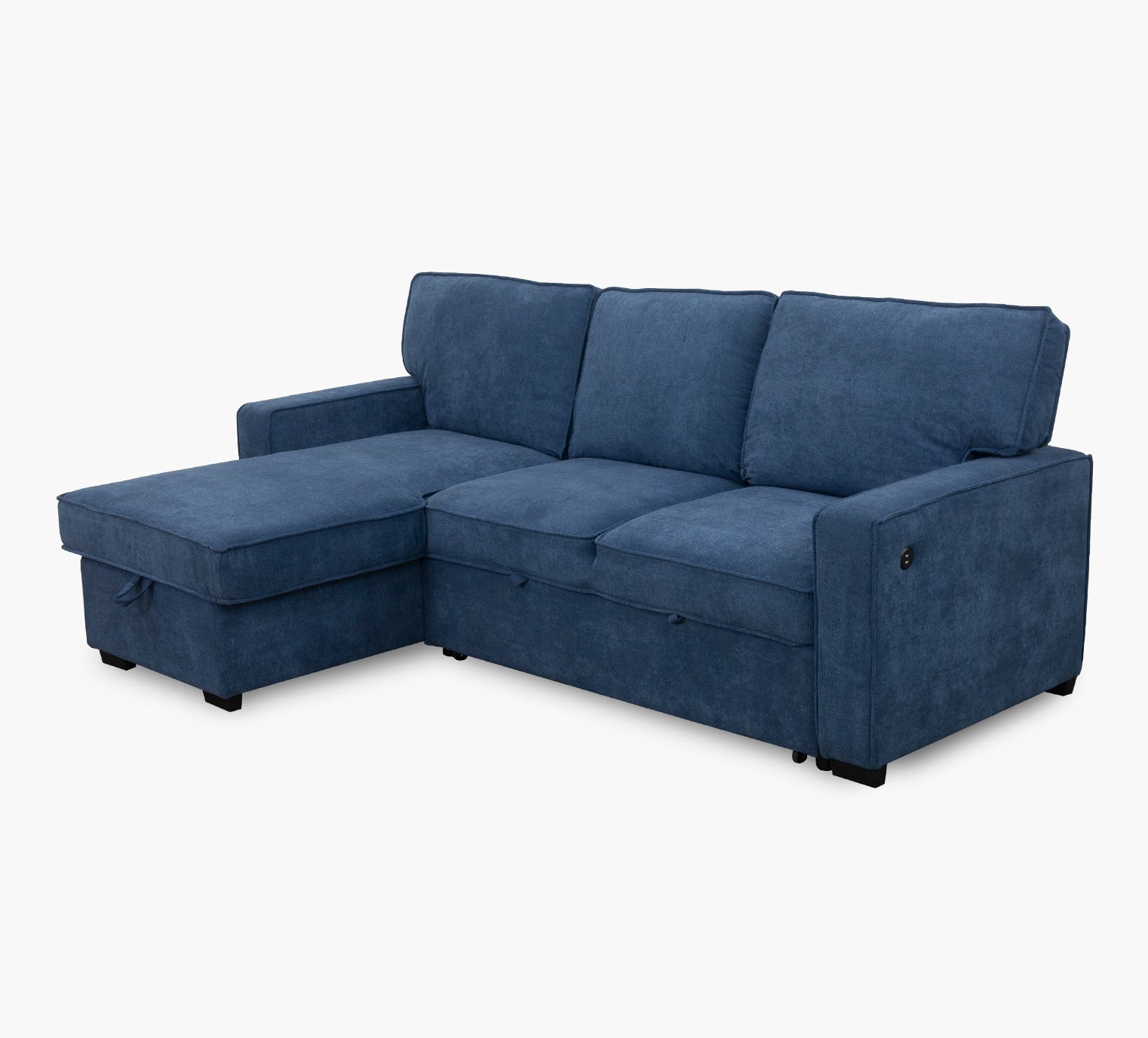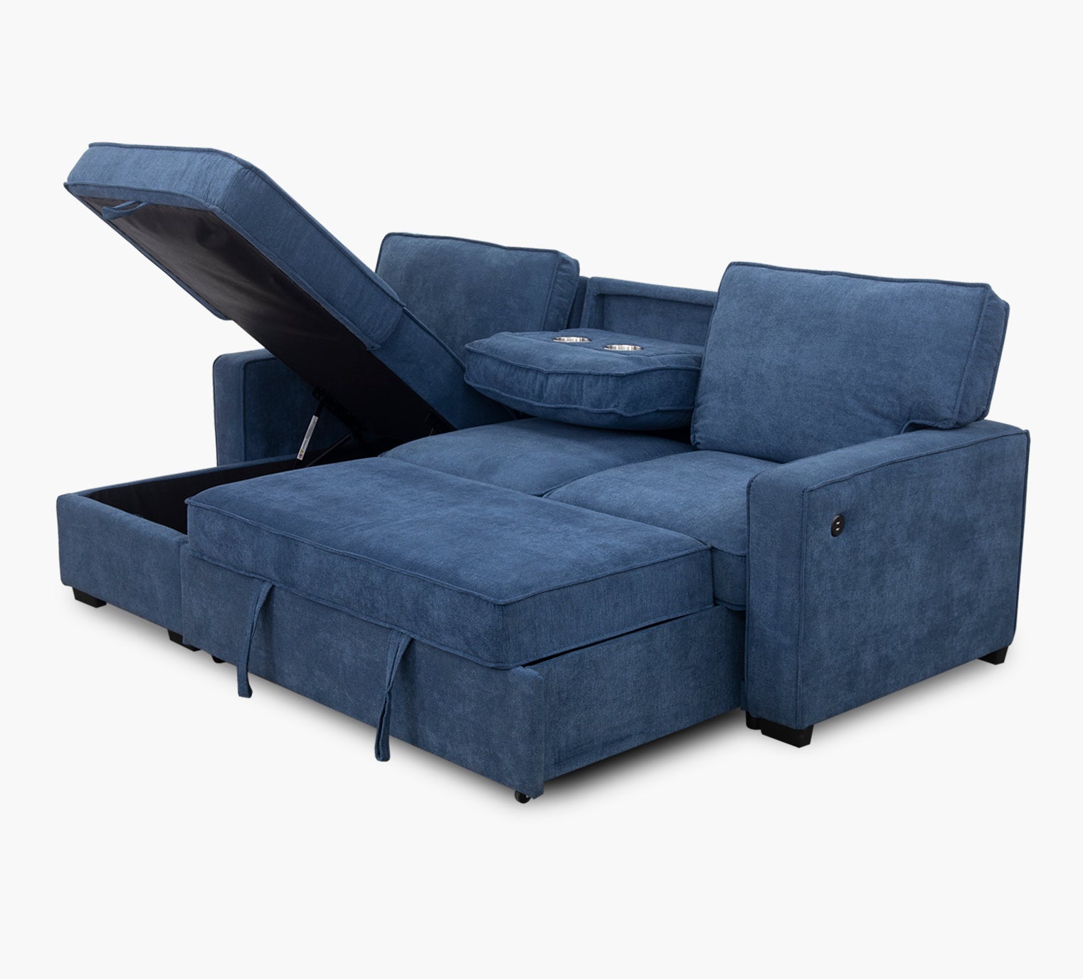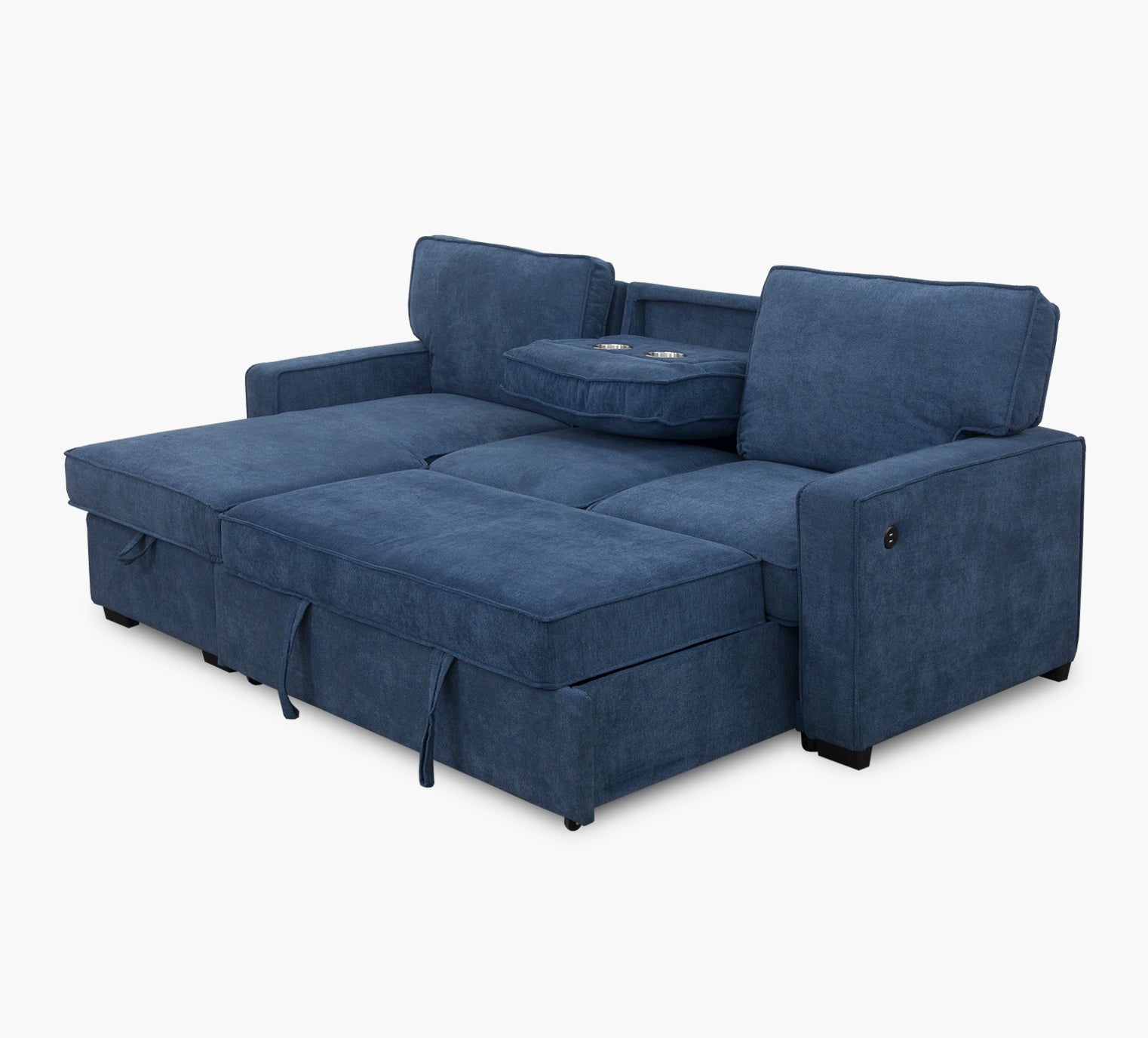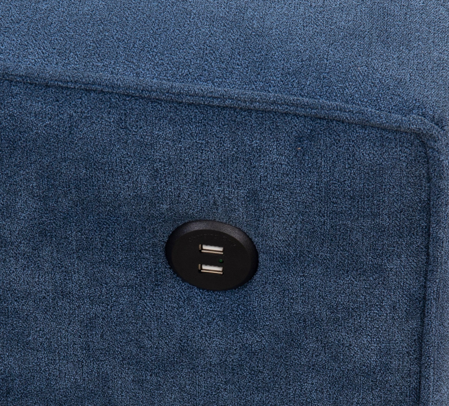 休闲现代 2 件组合式家具,配有可拉出的脚凳床和隐藏式储物空间。这款双人沙发采用海军蓝色面料装饰,配有带杯架的下拉式桌子和扶手上的 USB 充电装置。这款躺椅的座垫下方设有隐藏式储物空间,扶手上还设有 USB 充电功能。